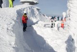 V neděli jsme se vrátili na Davidovky a podél sjezdovky vystoupali na Moravské boudy, kde Jirka s Lenkou nutně potřebovali zkontrolovat dcerku na lyžáku. Dál jsme šli k Petrovce a po hřebeni přes Dívčí a Mužské kameny na Vysoké kolo a Sněžné jámy. A pak už to bylo skoro jen z kopce - na Tvarožník a na Voseckou, Krakonošovu snídani a podél Mumlavy do Harrachova.