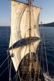 Pokračujeme v obeplouvání Elby po směru hodinových ručiček. Kotvíme před Azurovou jeskyní. Musíme k ní ale doplavat a proplavat dovnitř, což není vůbec lehký úkol, ale všechny děti to zvládly. Ještě těžší plavání nás čeká později, když jedeme zkoumat vrak lodi. Vítr dělá vlny a stále nás strhává. Nicméně části vraku jsou 2-3 metry pod hladinou a tak není problém si na něj sáhnout i bez potápěčské výzbroje. Vrak jsme si prohlédli, ale některé děti se vrátily na loď na pokraji sil. Loď zoceluje! Filip a Aleš si pod vedením Medvěda vyzkoušeli i opravdové potápění. Plujeme dál. A náhle se na palubě zjevuje Jean Bart. Na různých plachtách, ráhnech a dalších prvcích lodě jsou upevněny kartičky s písmeny. Je potřeba názvosloví správně přiřadit, vložit do zprávy, vyřešit jednoduchou šifru a už je tu zpráva: „Klíč se nachází za obrazem Augustina Heřmana“. Šup do salónu a máme další klíč! Ovšem co to?! Na truhle jeden zámek zase přibyl?! Ano, to Pepa Dvorský, pra-pra-potomek Augustina Heřmana jeden zámeček přidal. Povídal pak dětem příběh o lodi a veleúspěšném kapitánovi Heřmanovi, který se z českého Mšena vypracoval na korzára, obchodníka a kartografa. Následoval kontrolní kvíz, který děti hravě zvládly a za odměny dostaly klíč k zámečku. A opět se zjevuje Francis Drake. V ráhnoví je rozmístěno 14 klíčů a každý námořník musí jeden snést dolů na palubu – někdo si troufne na košové ráhno, někdo jen kousek nad palubu. Přenocovali jsme v zátoce na severní straně Elby. A s piráty dnes ještě není konec! Za tmy se zjevuje Awilda, která po mladých pirátech vyžaduje znalosti souhvězdí.