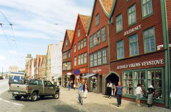 Skládáme si věci a chystáme se k druhému útoku na Bergen. Náš prvnícíl je dřevěný sloupový kostel, není tak velký jako heddalský, alestejně pěkný. V centru nás láká rybí trh, pak Bryggen. Je hezký, takjak ve všech prospektech. O čem jsme však nevěděli a co nás velmipřekvapilo, byly dřevěné sklady a kanceláře, umístěné za bryggenskýmprůčelím. Dřevěné malé uličky, sklady s kladkami, menší stavby - všeprosté a hezké.