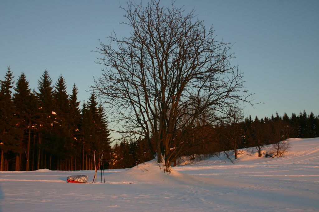 V neděli jsme provedli větší zkoušku - batohy jsme si zatížili láhvemi Dobré vody, abychom vytvořili váhu asi 20 kg a vyrazili jsme na okruh po Jizerských horách - asi 28 km v různorodém terénu jsme urazili za 6,5 hodiny, což nebyla žádná moc velká rychlost, ale měla by stačit. Oboje saně vydržely a osvědčily.