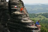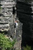 Skály jsme lezli pravda tak, že Honza provedl výstup a ukotvil smyčky, my ostatní už jsme lezli po zajištěné cestě jištěni shora. Honza nás na skále tak trochu přidržoval, ale i tak nám to dalo zabrat. Po třech stěnách jsme se šli projít skalním městem a na oběd, načež jsme si dali ještě jednu závěrečnou spáru. Mezitím už přijely holky a tak jsme byli zase komplet.