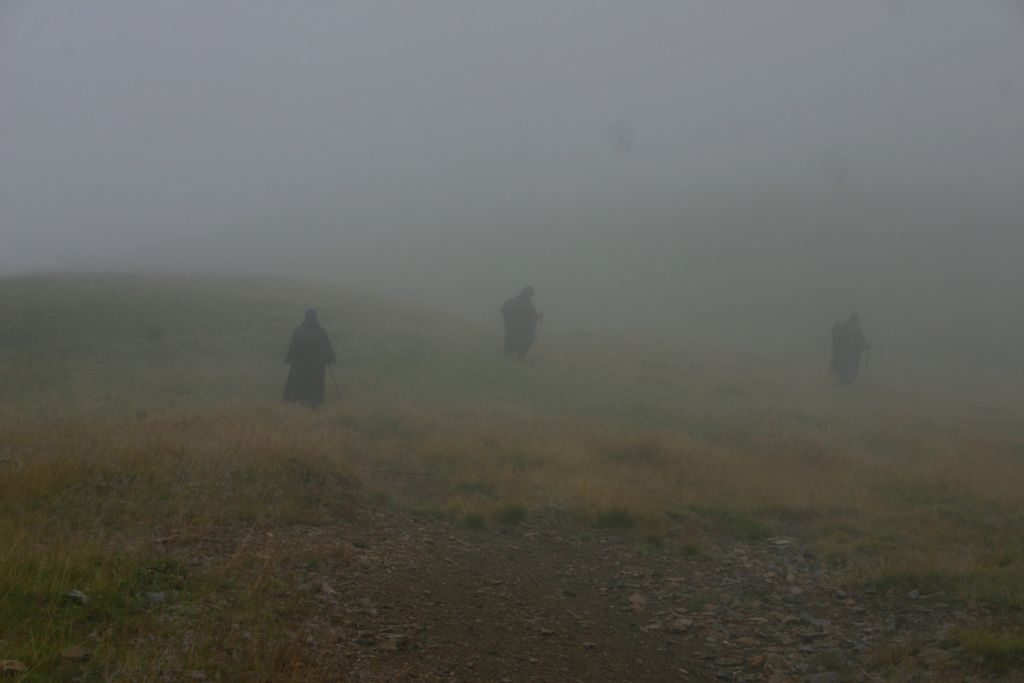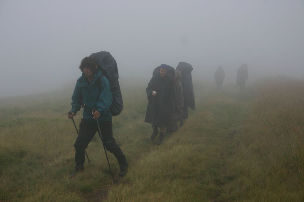 Ráno nás opět uvítalo deštěm, na balení sice přestalo, ale přes den byly časté přeháňky. Výhledy se nám tím opět skryly. Kousek za naším spaním byl přístřešek bačů s provizorní ohrádkou na ovce. Zrovna svářeli mléko a po projevení zájmu si chlapík vyhrnul rukáv košile, zanořil ruku hluboko do vědra s mlékem, vytáhl sedlinu, v rukách z ní vymačkal mléko a uhnětl kouli, kterou nám podal. Nebylo to špatné, jen to samotné nemělo moc chuť (a nic nám potom nebylo). Ukázalo se, že chlapík pracoval i v Čechách a naštěstí si odvezl dobré vzpomínky. Viditelnost byla mizerná, takže jsme ani nevnímali horu Gropu a Siglanskij. V jeden moment jsme při obcházení kopce sešli příliš dolů a museli jsme se vyšplhat příkře nahoru, abychom se našli a opět narazili na cestu. Předčasně jsme poloninu opustili nad začátkem Koločavy, protože nahoře nebylo nic moc vidět. Mlha se držela nahoře, takže po nějaké době se pod námi objevily domky a pomalu jsme se přes louky a zahrady dostali až na cestu vedoucí skrz celou vesnici. Na kraji byly vidět nově postavené domky, kupodivu i ty měly za turecký záchod domem a studnu na zahradě. Cesta se postupně rovnala a díry se zmenšovaly. Cestou jsme potkávali spoustu lidí a spousty odpadků, mnoho z nich i v potoce, který tekl podél cesty. Konzum a PET flašky dorazil dříve než svoz odpadu, a tak přehrádkami na koupání přetékaly odpadem. Místy bylo možné najít starý nábytek či kusy aut. Po asi 3 km jsme dorazili na křižovatku, kde začínalo "centrum", což se poznalo podle asfaltované cesty. Kousek odtud byla škola a několik obchodů. Zpravidla prodávaly všechno - jídlo, lustry, pití, plechovou vanu, kytky… My jsme směřovali do bývalé četnické stanice, která byla zrekonstruována a dnes v ní Natália Tumarec a její muž provozují hostinec s možností ubytování. Ceny jsou na Ukrajinu mírně vyšší, ale standard nadprůměrný. (Šašlik se salátem a brambory: 22 UAH, pivo 2,5 UAH, čokoláda 3,5 UAH, vodka 1,5 UAH; přespání na zemi v pokoji tak pro 6 lidí 10 UAH za osobu). Vcelku dobrý podnikatelský záměr, do Koločavy jezdí jen Češi (do jiných míst jezdí Poláci a jiné národnosti) a každý sem zavítá. Podle fotografie v lokále ještě v roce 2000 stanice neměla střechu, v provozu je snad od roku 2003. Naše ubytování bylo domluveno v domku Natálie zesnulých rodičů. Domek byl vlhký a trochu zatuchlý, suchý záchod na dvorku, studna opodál. Byla tam však také sauna a cosi jako sprcha (vývod trubky u stropu). Ačkoliv jsme měli připravené a povlečené postele, spali jsme raději ve spacácích. Domek uchovával ducha dřívějšího žití - staré postele a peřiny, křížek na zdi, kredenc… Jedna noc nás stála 130 UAH. Další alternativou je přespání ve škole za 5 UAH.