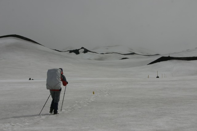 Ve čtvrtek 7. 6. jsme vstali dřív, posnídali, Bjärni mi poskytl řadu informací k přechodu mezi ledovci (letos jsme jedni z prvních, kteří tudy půjdou) a v knize mi ukazoval, kudy vede cesta, protože se nebyl jist, jestli značkovací tyče ještě nebudou pod sněhem. V 10:30 jsme vyrazili na cestu. První kousek vedl po dně údolí, pak už začalo stoupání. Vyšlapaná cestička vytrvale stoupala travnatým hřebenem Kattahryggur. Postupně se nám odkrýval pohled na kopce a ledovce před námi a řeku Krossá za námi. Cestou jsme potkali jednu švédskou dvojici, která si však na přechod netroufla a vrátila se. Bylo pod mrakem a vcelku jasno, jen z údolí se nahoru valila mlha. Báli jsme se, že v mlze bude obtížné najít cestu. Měli jsme však štěstí, nad kopci vítr mlhu odfoukával pryč od nás. Po další hodině jsme vylezli na plošinu Morinsheiði. Působivá velká placka, plná kamení a vodou nasáklého štěrku. Za ní nás čekalo sněhové pole. Bylo prudké a sklouznutí by znamenalo 200 metrů rychlého sjezdu zakončeného mezi kameny. Řetězy byly pod sněhem a nezbylo, než se přimknout ke skále a nepadat. Zde cestu vzdal i Belgičan, s kterým jsme se cestou potkávali a také se vrátil. Ještě kousek po kamení a suti a začala prudká sněhová pole, nekonečné stoupání jako po schodech. Někde byly tyče dobře vidět, jindy koukalo jen horních pár centimetrů z třímetrové žluté tyče. Cestu však nebylo těžké najít a viditelnost byla stále dobrá. Konečně se zlomilo stoupání v náhorní plošinu a začínalo sedlo Fimmvörðuháls, kde již převýšení nebyla tak výrazná. Převažovala cesta po sněhu a dobře jsme viděli jak ledovec Eyjafjallajökull napravo, tak Mýrdalsjökull nalevo. Po 16. hodině jsme uviděli rozcestník a označili jsme toto místo za polovinu přechodu. Po chvíli jsme viděli chatu Fimmvörðuháls na hřebeni mezi ledovci, věděli jsme však, že je stále ještě zavřená. Pokračovali jsme dál a cesta se začala mít sestupnou tendenci. Po chvilce jsme došli k záchranné chatě – u ní pokuřoval jakýsi klučina z Belgie, který se vydal na trek z druhé strany a hodlal tady přenocovat. Chata je volně přístupná, není zde však ani voda či vařič. Působila dost neútulně, bylo v ní špína a zapáchala; za špatného počasí to ale může být dobrodiní. My jsme zde povečeřeli (raději venku na lavičce; 17:30-18:30) a pokračovali v sestupu dále. Slunce zapadá až kolem půlnoci a světlo je pořád – ohromná výhoda pro poutníky. Z jižní strany se zatahovalo a padla trochu mlha. Navíc tato strana byla hůře značená a mnoho tyčí bylo po zimě popadaných. Šli jsme od jedné k druhé a občas jsme směr na chvilku museli odhadovat. Mnoho tyčí jsme alespoň provizorně postavili. Po čase jsme se setkali s cestou pro terénní auta a šli převážně po ní. Po dalších kilometrech jsme se připojili k řece Skóga a šli podél ní až k mostu. Od mostu vedla cesta podél řeky, lemovaná četnými vodopády. Na travnaté plošince (jaká změna po dni plném kamení a sněhu!), hned za prvním vodopádem, jsme se utábořili na noc (asi 20:30).