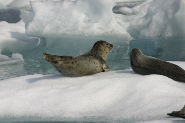 Autobus odjížděl v 14:30 a do Jökulsárlónu nás odvezl (2x 1100) za zhruba hodinu. Jökulsárlón je jerezo vzniklé po ustupujícím ledovci. Na jeho jedné straně se z čela ledovce odlamují kry, které v jezeře tají 5-7 let, ty nevětší dokonce 10 let, a nakonec odplují do moře. Turistický ruch zde žije kavárnou a obojživelným vozítkem (2x 2300 ISK), které nabere turisty, odveze je ke břehu, sjede do vody a začne plavat. Proplouvá mezi krami, průvodce povykládá o ledovcích a loď dozajista mine malou kolonii tuleňů, kteří plavou ve vodě nebo se válí a opalují na některé z ker. Místo je to však velmi krásné, jezírko má nádherně modrou barvu, kry jsou různě velké, různě barevné (od černých přes modré a bílé až k průzračným) a jejich tvary roztodivné. Měli jsme navíc štěstí – bylo převážně modré nebe a svítilo sluníčko.