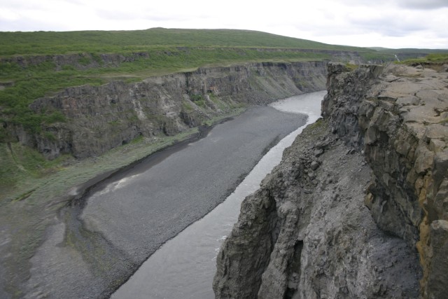 Po poněkud delší cestě po silnici č. 1 (Ring Road) jsme odbočili na prašnou silnici k vodopádu Dettifoss a dále na jih. Cesta byla plná výmolů a úplně jsme se divili, co takový Yaris projede. Než jsme dojeli k vodopádu, byl už mohutně zaprášený. Dettifoss je obrovský, údajně nejmohutnější vodopád v Evropě. Výhled na něj je jen shora, zato člověk může jít až k jeho horní hraně. Vodní tříšť a mlha se vznáší zpět do výšky vodopádu. Pod ním vytváří řeka Jökulsá hluboké koryto se svislými čedičovými stěnami, čímž vzniká impozantní údolí. O tom se přesvědčujeme ještě o 10 km dále na kopci, který odhaluje menší, ale roztomilý vodopád Hafragilsfoss, a pořádný kus kaňonu.