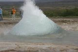 Další turistickou atrakcí na „zlatém okruhu“ byl Geysir (15:30-16:30). Ten, který se tak jmenoval (a prý tak vzniklo slovo „gejzír“ a rozšířilo se o světa), už netryská, je z něj jen modravé klidné jezírko o průměru asi 6 metrů. Vedle něj je však mladší bráška Strokkur, který je menší – má v průměru jen asi 2-3 metry a tryská jen tak 15-30 metrů, zato však každých 5-10 minut. Nejdříve je v jícnu díra, která se postupně plní vodou. Pak už je jí tak po okraj a její hladina se zvedá a klesá o několik centimetrů nahoru a dolů. Najednou se na povrchu objeví bublina, která jakoby hladinu nemohla protrhnout, ale vyduje jí asi metr do výše. Nakonec praskne a proud vody a páry vytryskne vzhůru. Voda se vylije, v jícnu zeje díra a divadlo může začít znovu. Kolem je ještě několik nepravidelně činných gejzírů, horkých pramenů nebo různobarevných jezírek. Některá prý mají nebezpečně vysokou teplotu.