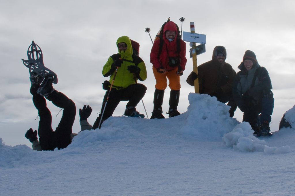 Většinu cesty po hřebeni jsme šli na sněžnicích, ale nebyly až tolik třeba, na většině míst byl sníh ztvrdlý, zmrzlý nebo odvátý. To ale určitě neplatí vždy. Na některých místech se hodily hroty na sněžnicích. Ale mačky, cepín ani jiné "ledovcové" pomůcky na naší trase potřeba nebyly.