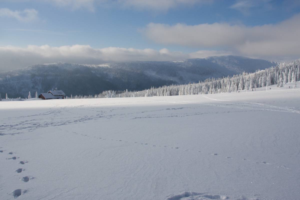 V pátek ráno jsem vyrazil v 8 ráno z Černého Mostu a kolem 11 jsem z Horního Maršova stoupal nahoru na Rýchory. Vydal jsem se po česko-polské hranici a až na rozcestí pod Lysečinskou boudou byla lidmi prošlapaná stopa. Dál na Lysečinskou horu už vedla stopa jen jedněch běžek - majitelku jsem záhy potkal při sestupu. Já jsem vytrval a se západem slunce jsem se dostal na náhorní planinu, která mě nadchla, připadal jsem si osamělý uprostřed divoké přírody, jak v divočině na kanadské pláni. Sledoval jsem odsud západ slunce a za posledních zbytků světla jsem sjel dolů na Pomezní boudy. Tady jsme se potkali s Aničkou, Jirkou a Lenkou a přespali v hotelu Trautenberg (700 na osobu se snídaní), kde výborně vaří jídlo i pivo.